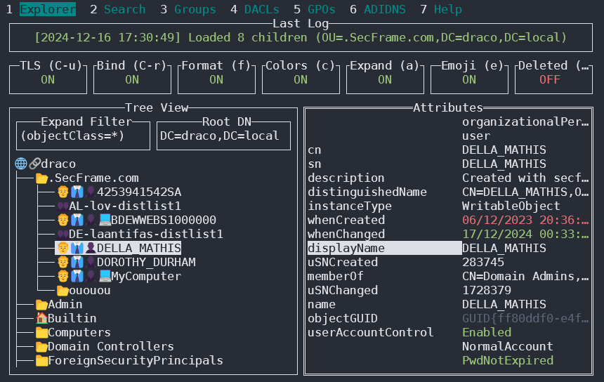 Godap is an interactive terminal user interface for LDAP that can be used to interact with objects and attributes in AD and other LDAP servers. It is available for Windows, Linux and MacOS and supports simple binds, pass-the-hash, pass-the-ticket & pass-the-cert, along with several other specialized features such as searching/creating/changing/deleting objects, adding/removing users from groups, changing passwords, editing object permissions (DACLs), modifying Active-Directory Integrated DNS (ADIDNS), exporting to JSON files, etc.