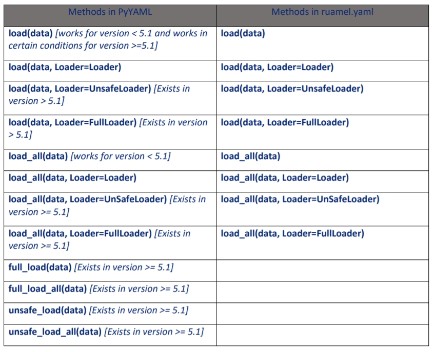 #deserialize the python objectThe previous code used unsafe_load to load the serialized python class. This is because in version >= 5.1, it doesn’t allow to deserialize any serialized python class or class attribute, with Loader not specified in load() or Loader=SafeLoader.